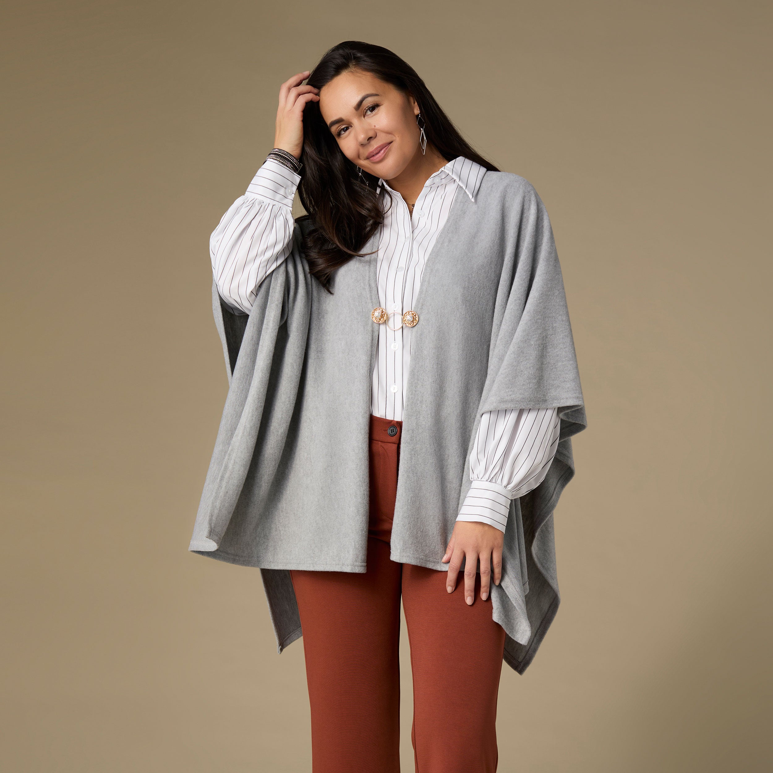 Say hello to your most versatile fashion accessory. The Embrace Clip-on Fashion Fastener is a clip-on accessory that can be worn three ways: connect your open cardigan, cinch your sweater, or clip your glasses. Pair with cardigans, wraps, ponchos, dresses and ruanas. The patented Embrace Fashion Fasteners make a great gift!