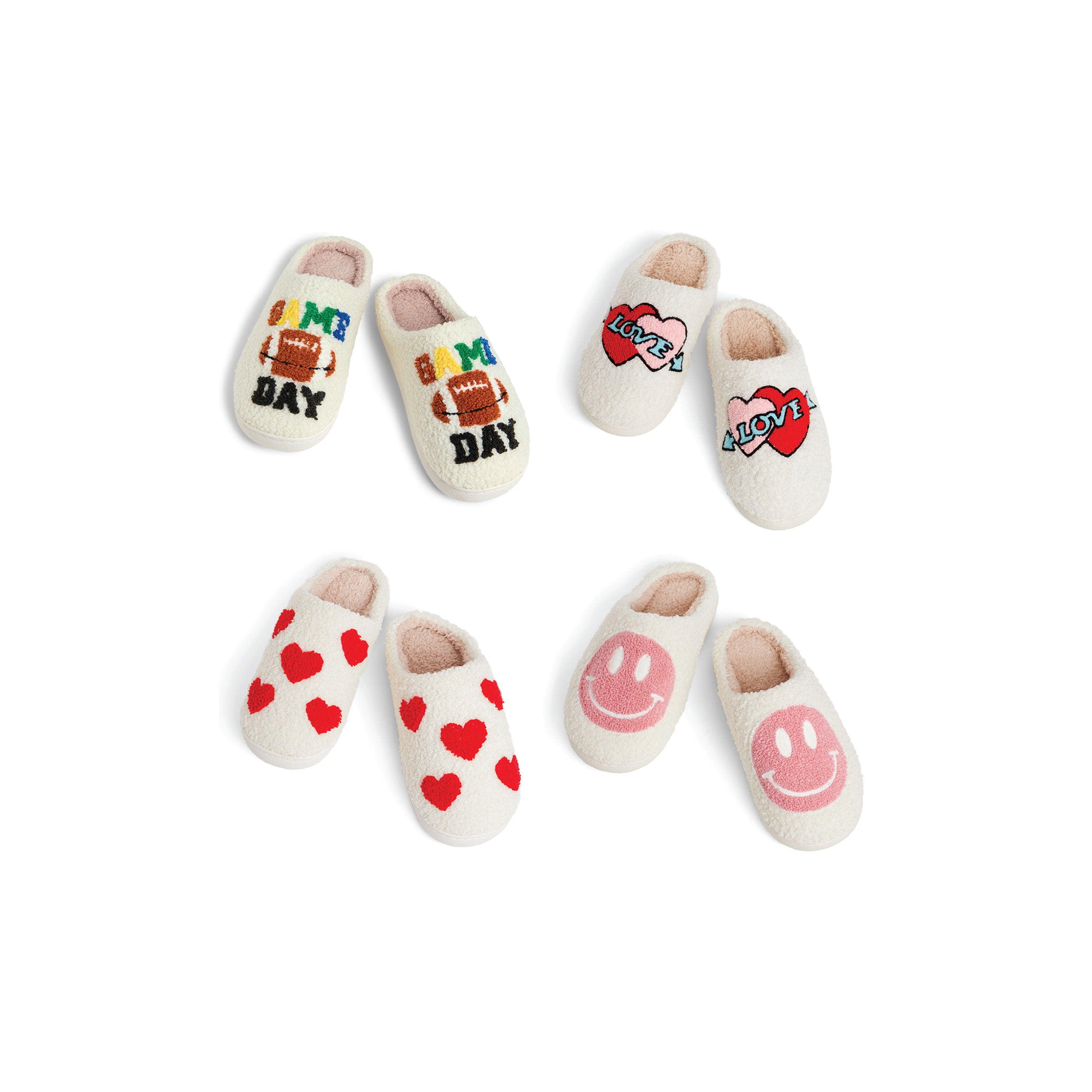 A total of 18 pairs (3 styles, 2 of each size). Treat your feet to ultimate coziness with our Happy Feet Slippers. Perfect for the holiday season, these festive slippers are the ideal Christmas gift for your loved ones (or yourself!). Slip them on and feel the warmth and comfort all day long. Size Small (6-7), Size Medium (8-9), Size Large (10)