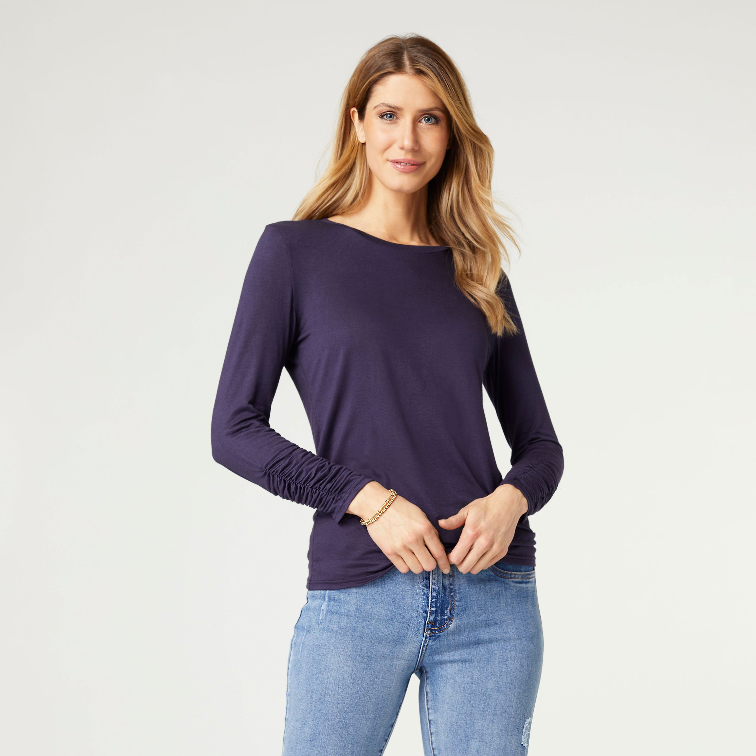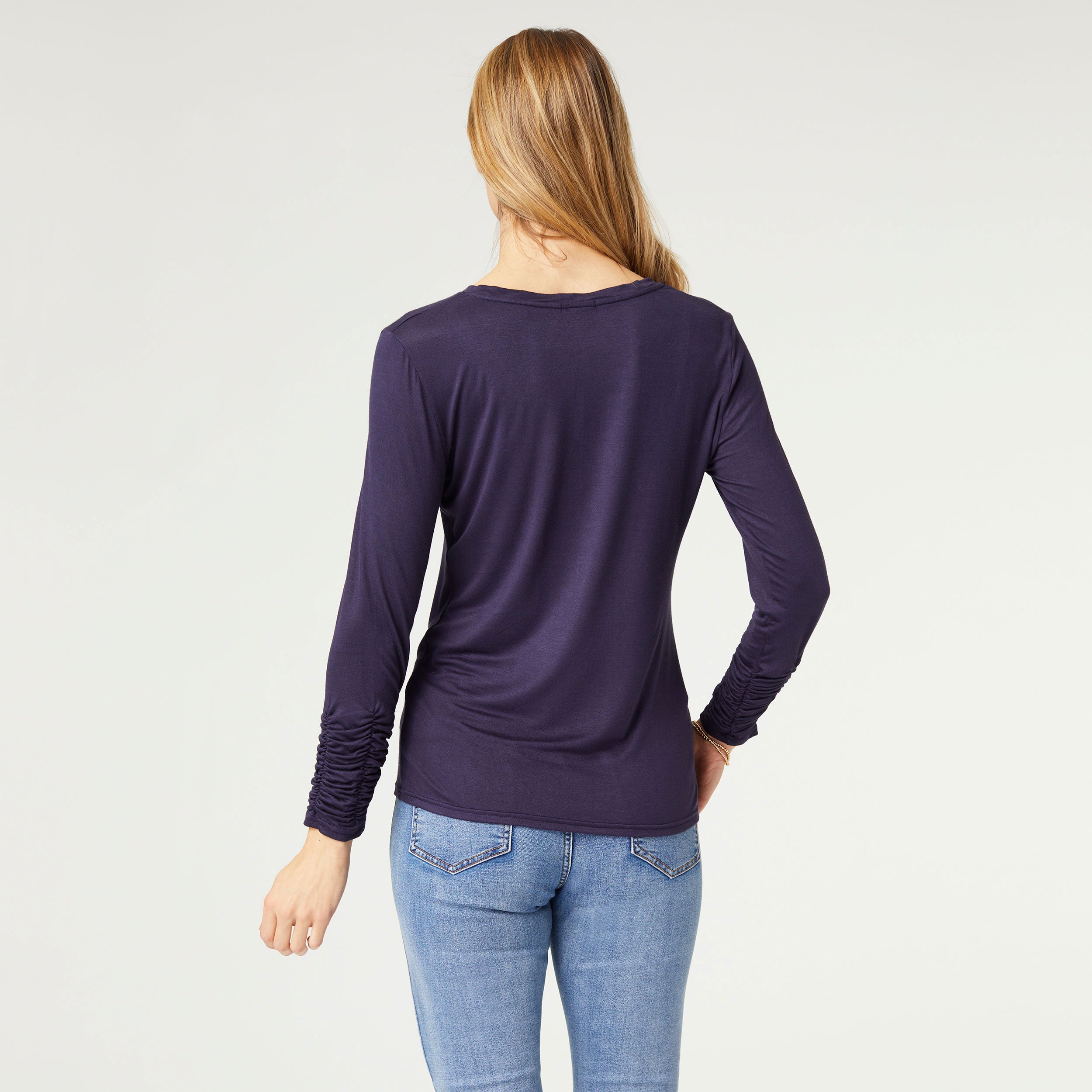 This essential is perfect for easy layering and outfit building. Features a luxe lightweight fabric, flattering cinched sleeves and versatile crew neckline.