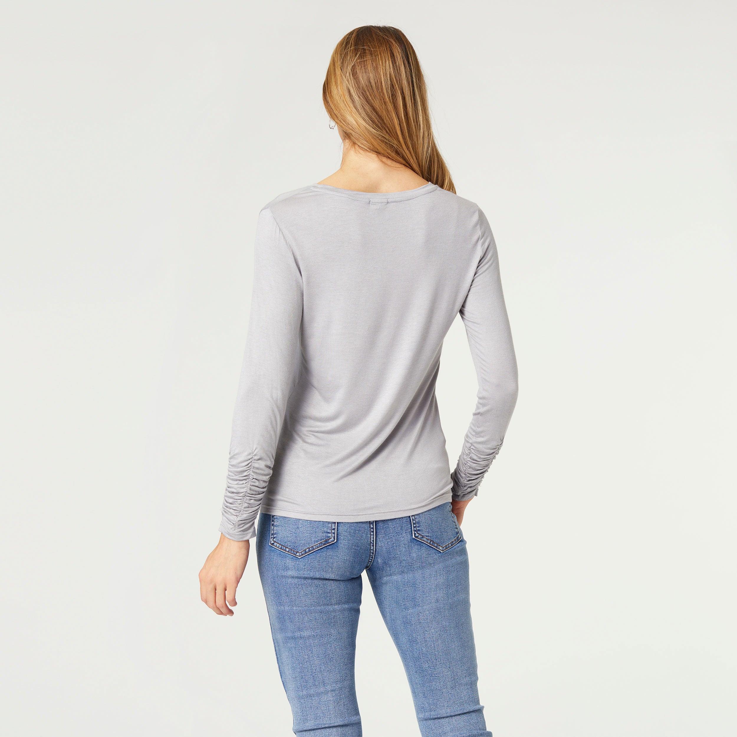 This essential is perfect for easy layering and outfit building. Features a luxe lightweight fabric, flattering cinched sleeves and versatile crew neckline.