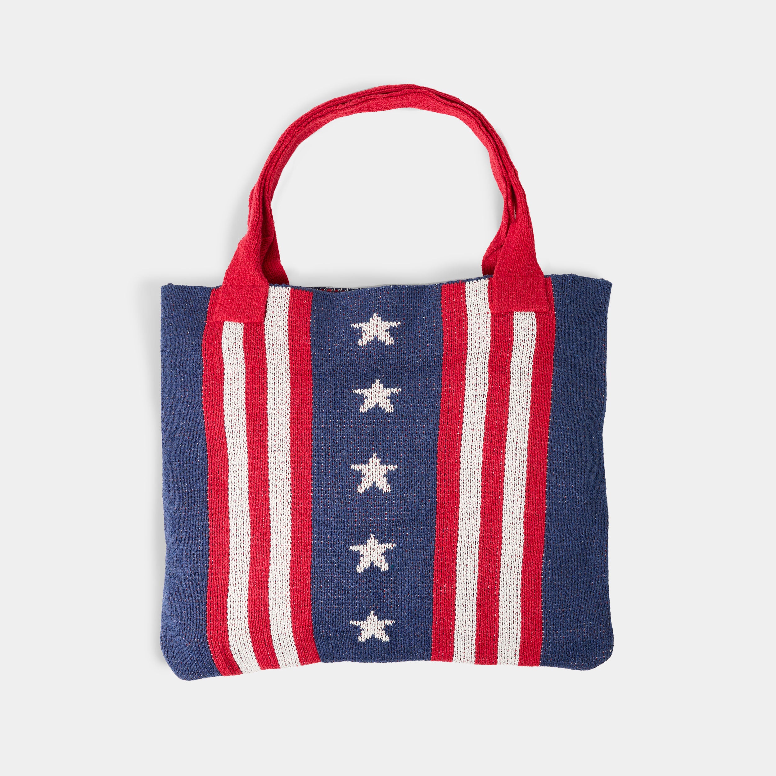 Soft knit bag with dual top handles. Open, unlined interior. Pure patriotic fun. Perfect for Memorial Day, 4th of July and all summer long!