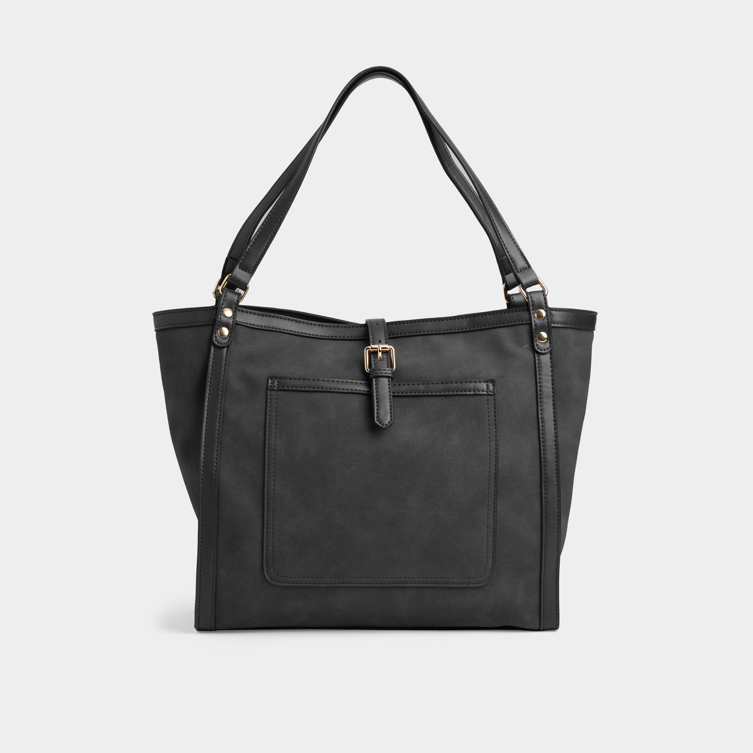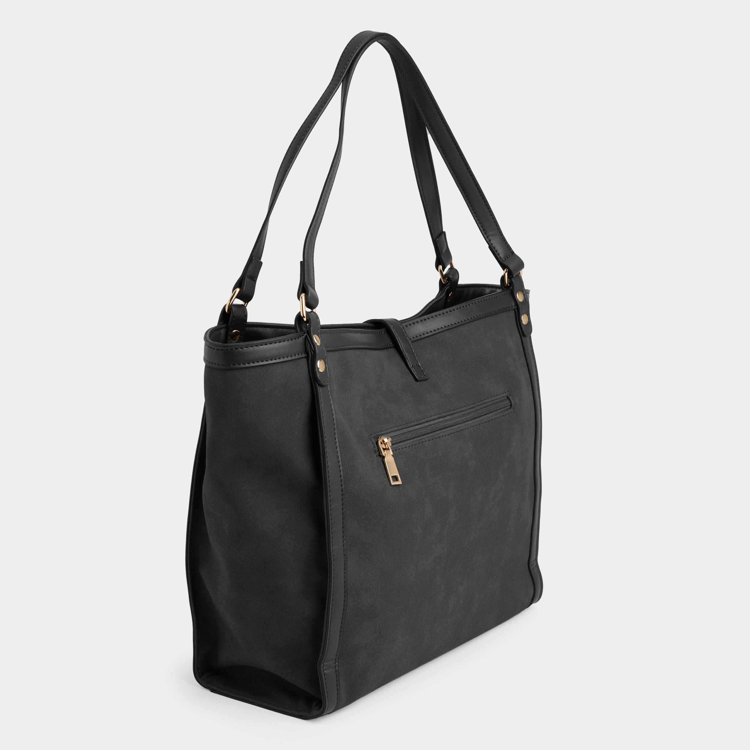 Open-style tote made of soft faux suede and vegan leather trim, external pocket for cell phone access, magnetic snap closure with decorative buckle clasp, spacious interior compartment with built-in storage, dual top handles.